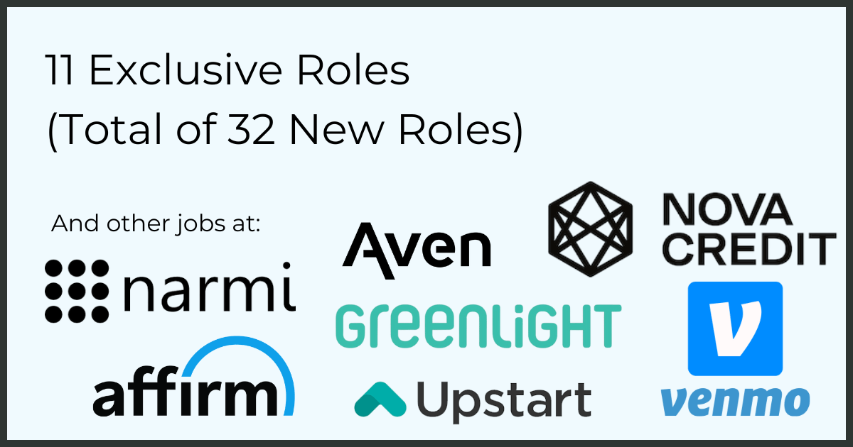 Roles at Narmi, Affirm, Upstart, Venmo, Greenlight, Nova Credit, Aven, and more....