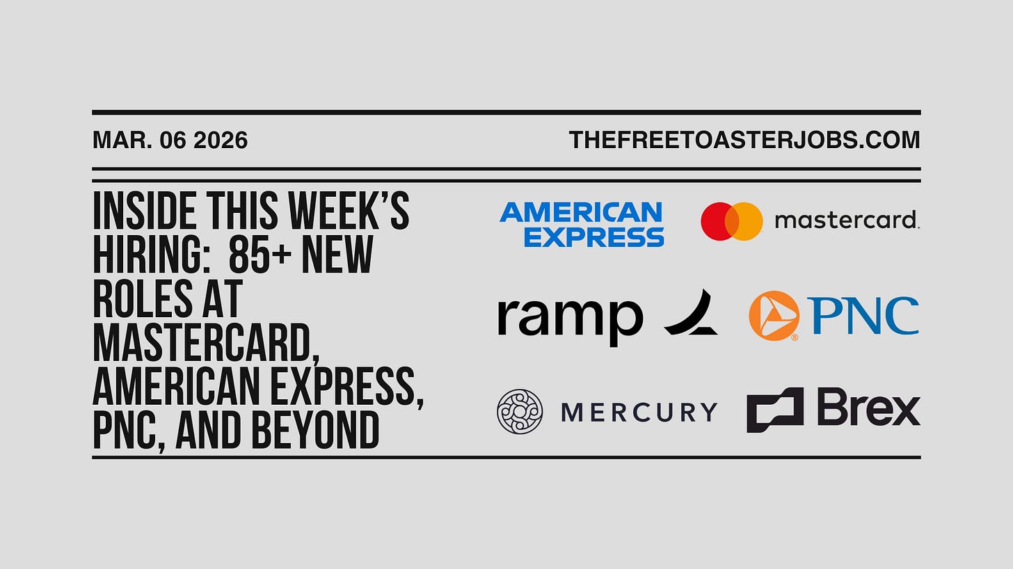 If you’re hiring across fintech, banking, or financial services, email the job details to info@thefreetoaster.com and we’ll include it in an upcoming Jobs Edition.