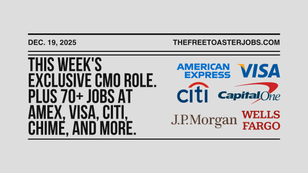 This Week's Exclusive CMO Role. Plus 70+ jobs at AmEx, Visa, Citi, Chime, and more.