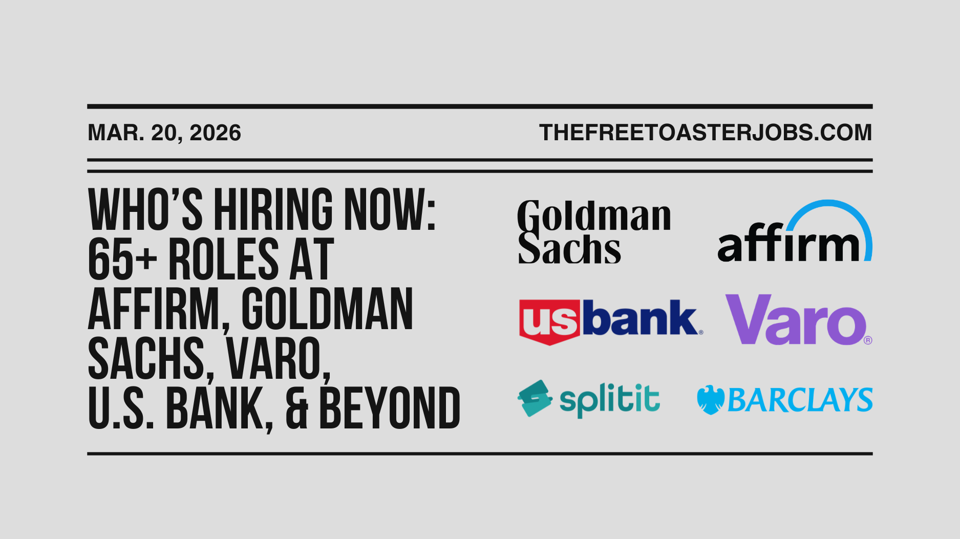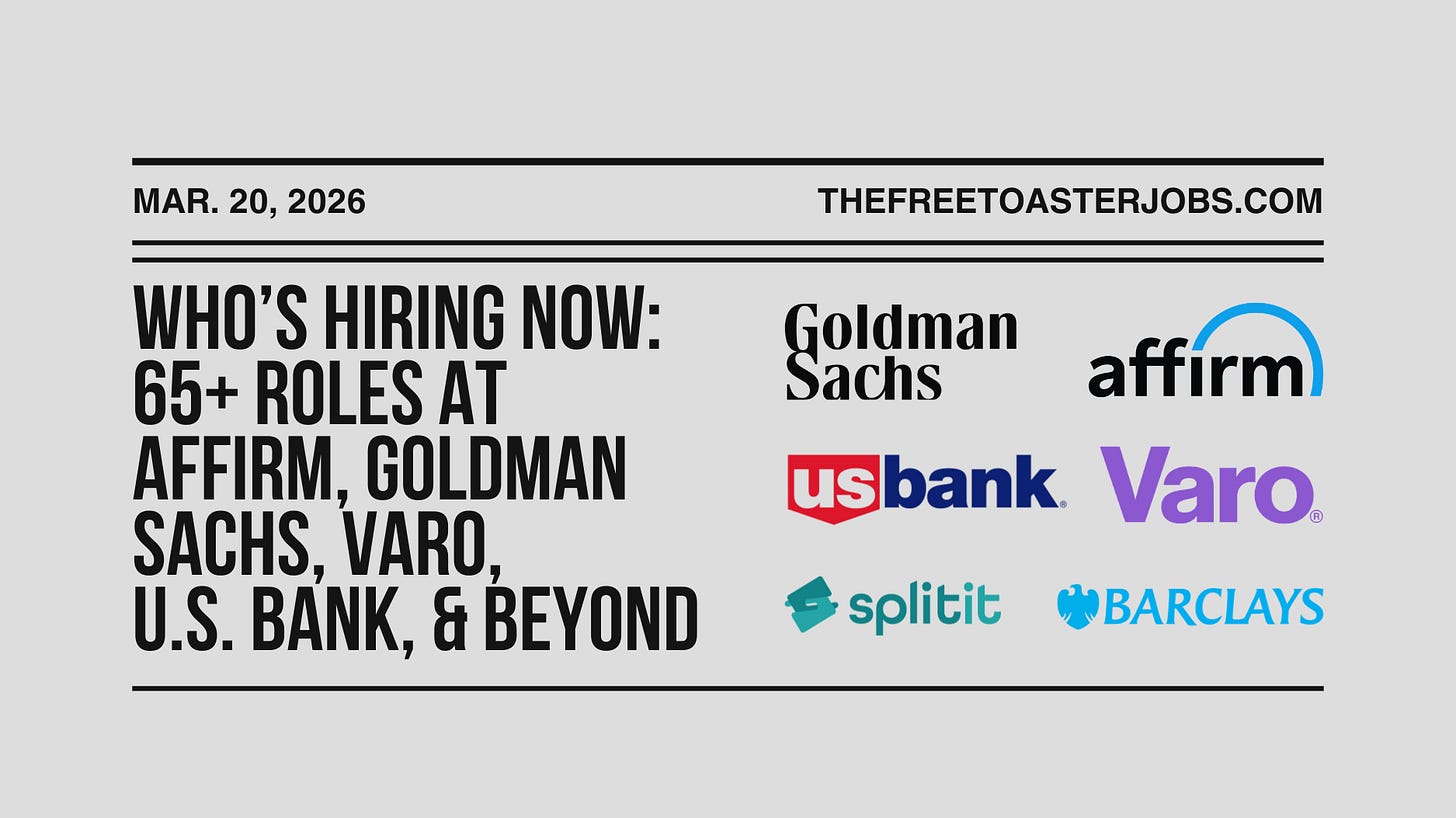 If you’re hiring across fintech, banking, or financial services, email the job details to info@thefreetoaster.com and we’ll include it in an upcoming Jobs Edition.